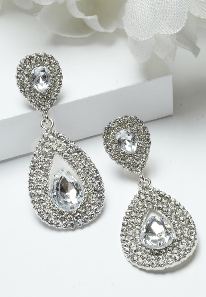 These silver-colored water droplet crystal earrings are a stunning and sophisticated accessory that can add a touch of glamour and elegance to any outfit. These earrings feature water droplet-shaped drops made from high-quality materials and finished with a silver-colored coating. The earrings are designed to dangle gracefully from the ears, creating a fluid and dynamic effect with movement.Pair these earrings with any ethnic attire; you will look stunning.