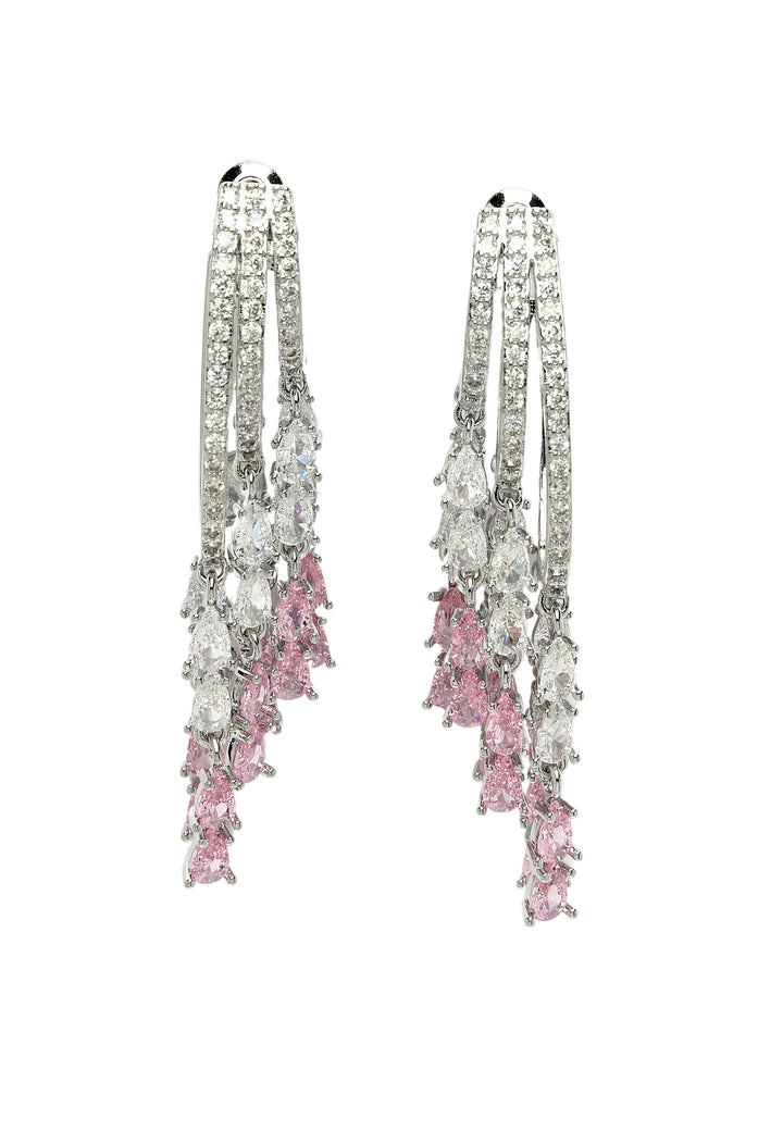 These zirconia dangle earrings are the epitome of elegance and style. Crafted with meticulous attention to detail, they boast a triple-layered design, creating a visually captivating effect from above. The lustrous pink hue adds a touch of femininity and sophistication to any ensemble. Each earring features three delicate dangles below, shimmering with the light as they sway gracefully with your movements. These zirconia dangle earrings are sure to make a statement wherever you go.