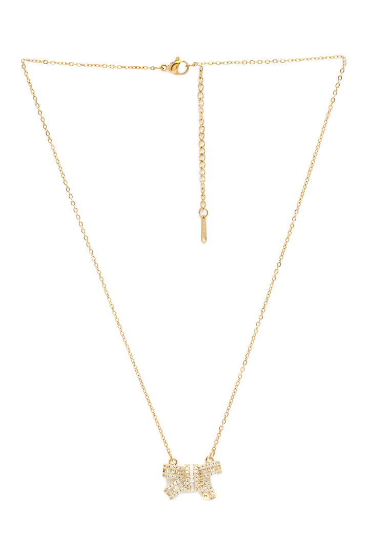Add a touch of charm to your look with this exquisite bow-shaped pendant necklace! Crafted in a radiant gold finish and encrusted with shimmering stones, the bow symbolizes grace and style. The intricate detailing and timeless design make it perfect for elevating everyday outfits or complementing formal attire. This necklace is a delightful way to express elegance and femininity, making it a must-have addition to your jewelry collection.