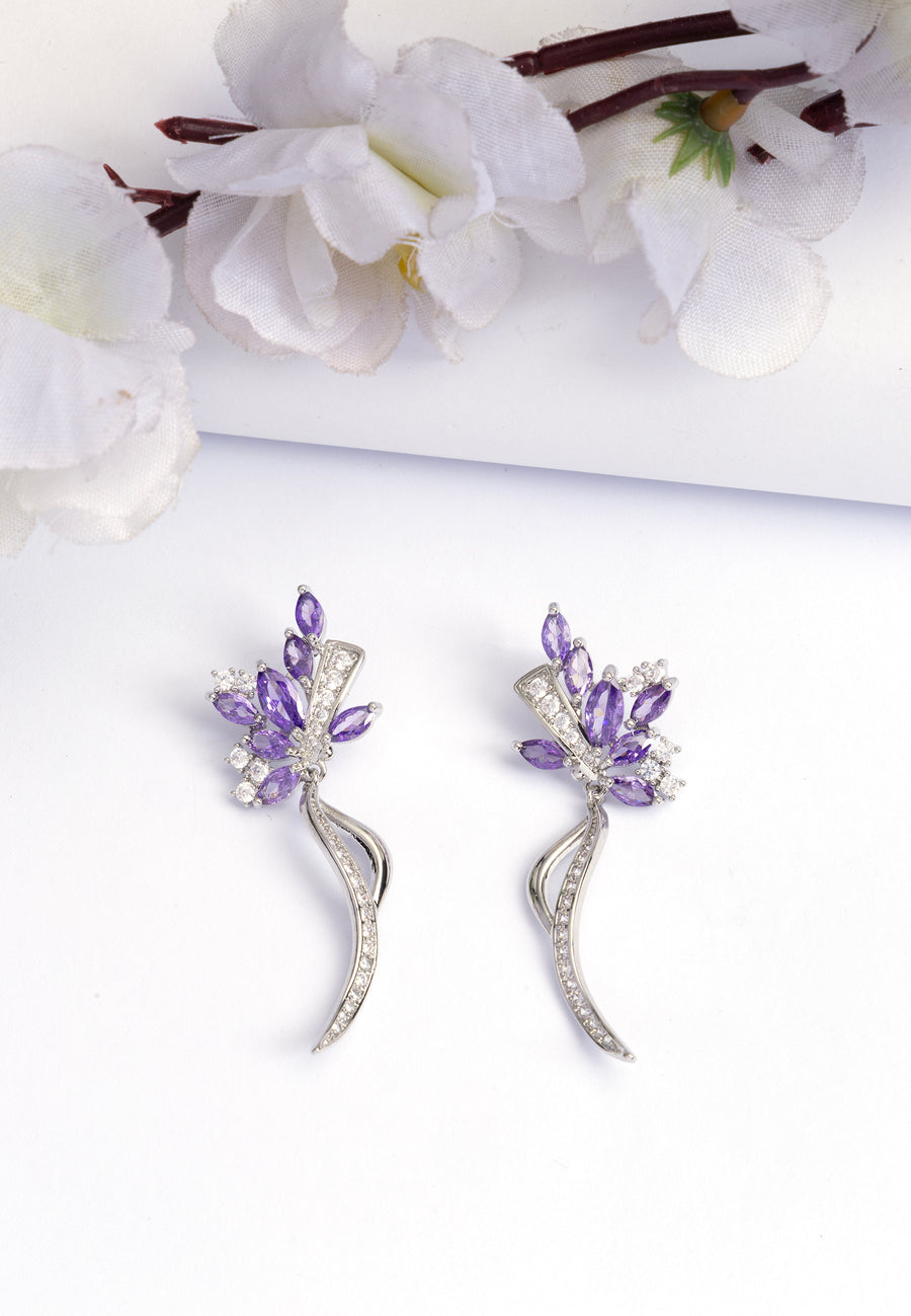 Questi eleganti orecchini a goccia presentano un design a strati scintillante. Un alone circolare di cristalli circonda una pietra viola profonda, che conduce a una delicata catena con un accento...