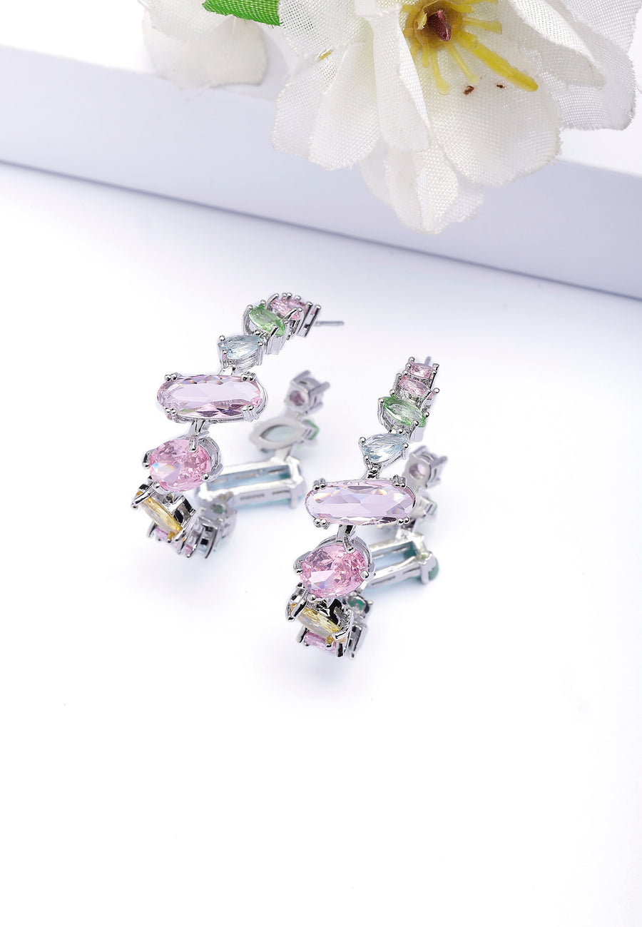 Questi orecchini a cerchio stravaganti presentano un assortimento giocoso di pietre dai toni pastello, raggruppate lungo una cornice metallica testurizzata. Le forme irregolari e i colori variati creano un aspetto...