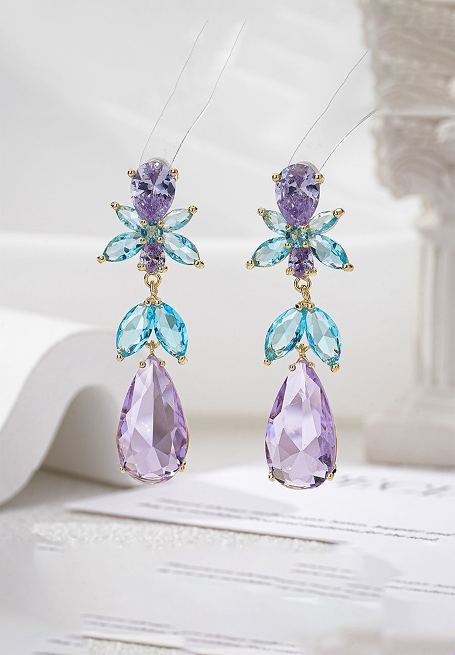 Gli orecchini pendenti floreali con zirconi cubici in multicolor con sfumature di blu e viola sono un accessorio vivace e accattivante che aggiunge un'esplosione di colore a qualsiasi ensemble. Questi...