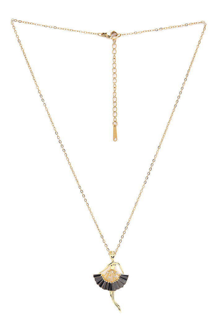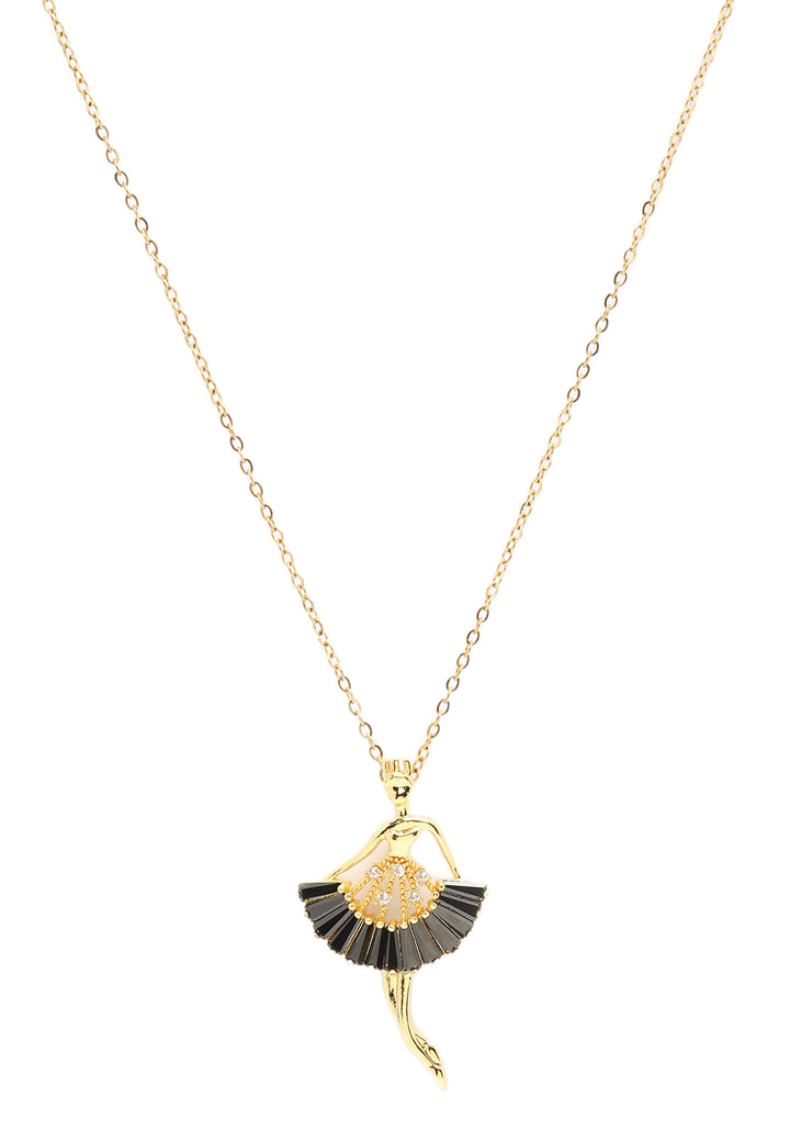 En fantastisk hyldest til dansens elegance, denne vedhæng viser en yndefuld ballerina prydet med en svævende tutu i sort emalje. Den gyldne figur udstråler charme og kunstneriskhed, hængende delikat på en matchende kæde i guldtonet. Perfekt til dansere, kunstelskere eller enhver, der værdsætter bevægelsens skønhed, tilføjer dette stykke et unikt og kunstnerisk præg til din smykkesamling.