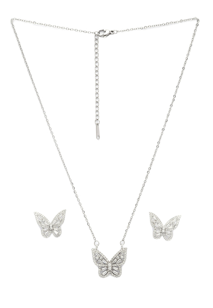 Njut av den fantasifulla charmen i detta fjäril-inspirerade smyckeset, designat för att ge en touch av elegans och glädje till din stil. Halsbandet har en vackert utformad fjärilspendant, vars delikata vingar är prydda med glittrande stenar som fångar ljuset med varje rörelse. De matchande örhängena speglar den förtrollande fjärilsmotivet och tillför en lekfull men ändå sofistikerad touch. Perfekt för alla tillfällen, detta set förbättrar enkelt din outfit, oavsett om du deltar i ett formellt evenemang eller lägger till lite glans till din vardagliga look. Lätt och strålande, det är ett underbart sätt att fira din kärlek till naturen och tidlös skönhet.